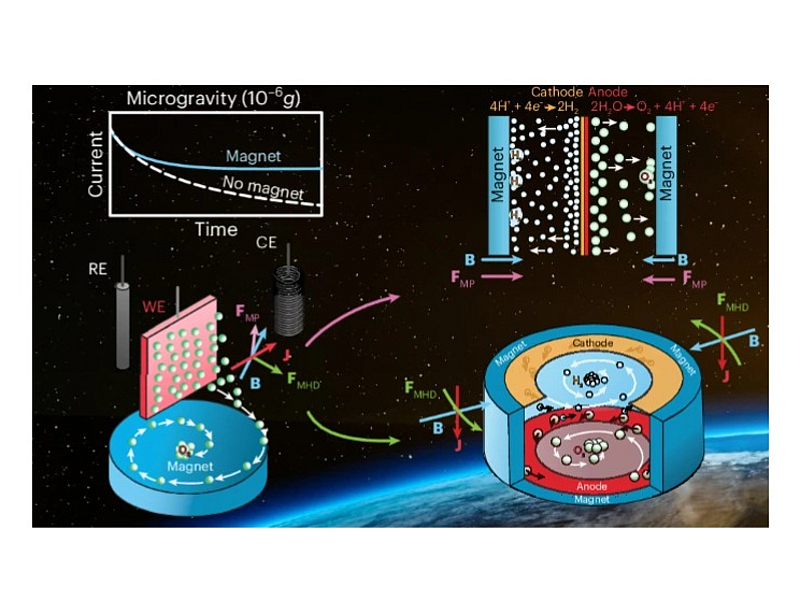 Since the early days of space exploration, the efficient production of oxygen and hydrogen via water electrolysis has been a central task for regenerative life-support systems. Water electrolysers are, however, challenged by the near-absence of buoyancy in microgravity, resulting in hindered gas bubble detachment from electrodes and diminished electrolysis efficiencies. Here we show that a commercial neodymium magnet enhances water electrolysis with current density improvements of up to 240% in microgravity by exploiting the magnetic polarization of the electrolyte and the magnetohydrodynamic force. We demonstrate that these interactions enhance gas bubble detachment and displacement through magnetic convection and achieve passive gas–liquid phase separation. Two model magnetoelectrolytic cells, a proton-exchange membrane electrolyser and a magnetohydrodynamic drive, were designed to leverage these forces and produce oxygen and hydrogen at near-terrestrial efficiencies in microgravity. Overall, this work highlights achievable, lightweight, low-maintenance and energy-efficient phase separation and electrolyser technologies to support future human spaceflight architectures