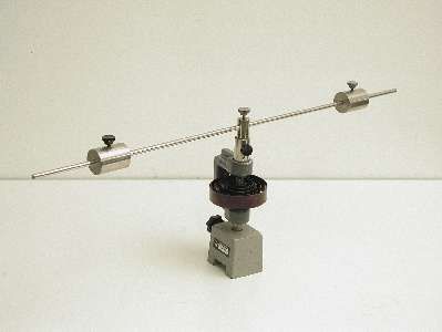 Das Trägheitsmoment kann durch Verschieben der beiden Massen verändert werden. Die Schwingungsdauer ist abhängig vom Trägheitsmoment.