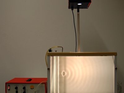 Die ebene Wasserwellenfront wird durch Luftdruckschwankungen im Wellenerreger erzeugt. Trifft diese Welle auf eine Doppelspaltblende, lässt sich dahinter die die Überlagerung und Interferenz zweier Kreiswellen beobachten.
