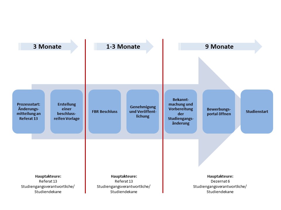 Um einschätzen zu können, wie umfassend die geplante Änderung des Curriculums ist, füllen Sie bitte das Formular "Studiengangsänderung" aus und schicken es ans Referat 13. Wir besprechen dann mit Ihnen das weitere Vorgehen und entwickeln eine Zeitplanung.