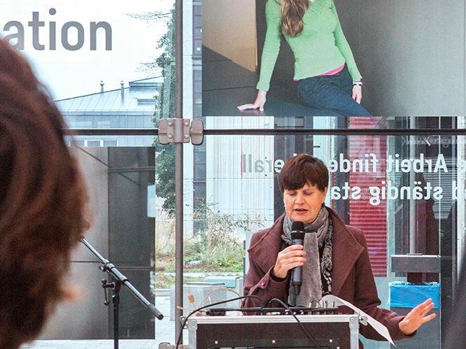 >right here< Wissenschaftlerinnen im akademischen Mittelbau, so lautet der Titel des Projektes, gestaltet und kuratiert von Birgit Wingrat mit Fotografien von Julia Baier. Ein Projekt, das >right here<, genau hier, – so gelesen geradezu tautologisch – wo wir, Sie und ich gerade stehen, gezeigt wird. Genau hier, das ist die Glashalle des Studierendenhauses, der Eingangs- , Durchgangsraum des Gebäudekomplexes GW 2, der gleichzeitig auch ein „Fortgangsraum“ ist, denn am Abend strömen ebenso viele Personen vom Campus fort wie am Morgen dort hin.