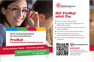 Der Masterstudiengang Prozessorientierte Materialforschung, ProMat richtet sich an Studierende der MINT Disziplinen, die eine wissenschaftliche Karriere anstreben und bereits eine konkrete Vorstellung über ihr zukünftiges Forschungsfeld haben. Dieser forschungsorientierte Studiengang ist im MAPEX Center for Materials and Processes verankert und wird von den fünf MINT-Fachbereichen der Universität Bremen getragen.