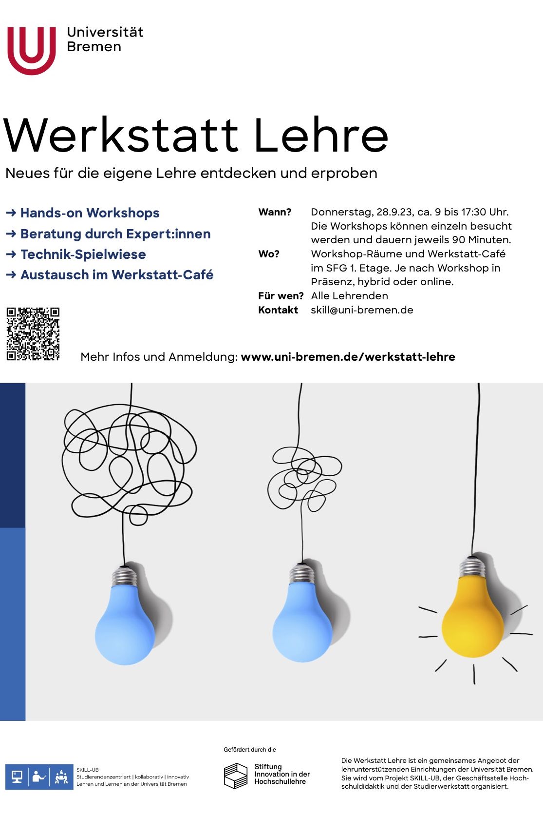 Die Werkstatt Lehre richtet sich an alle Hochschullehrenden sowie weitere interessierte Mitarbeiter:innen der Universität Bremen und bietet Ihnen die Gelegenheit, durch Workshops und persönlichen Austausch innovative, kreative Ideen für die eigene Lehre zu entwickeln. Im Rahmen des Projektes SKILL-UB findet am 2. und 3. September 2025 die sechste Werkstatt Lehre statt.