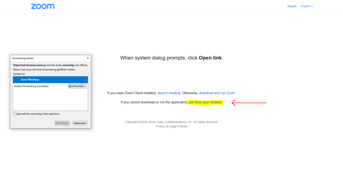 Click cancel in the system dialogue and choose "join from your browser" (yellow in image).