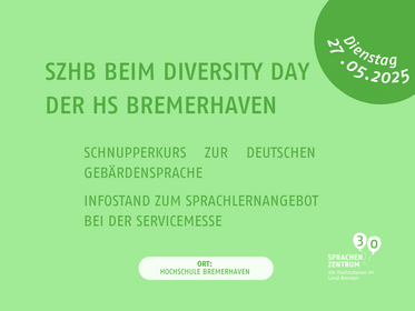 Am 27. Mai 2025 findet an der Hochschule Bremerhaven der Diversity Day statt. Angehörige der Hochschule können ein abwechslungsreichen Workshopangebot nutzen und den Marketplace besuchen - das SZHB ist auch dabei!