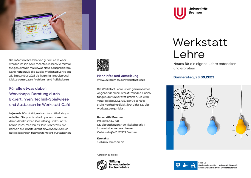 Die Werkstatt Lehre ist ein gemeinsames Angebot diverser lehrunterstützender Einrichtungen der Universität Bremen. Sie wird federführend von der Geschäftsstelle Hochschuldidaktik und der Staats- und Universitätsbibliothek und der Studierwerkstatt organisiert.