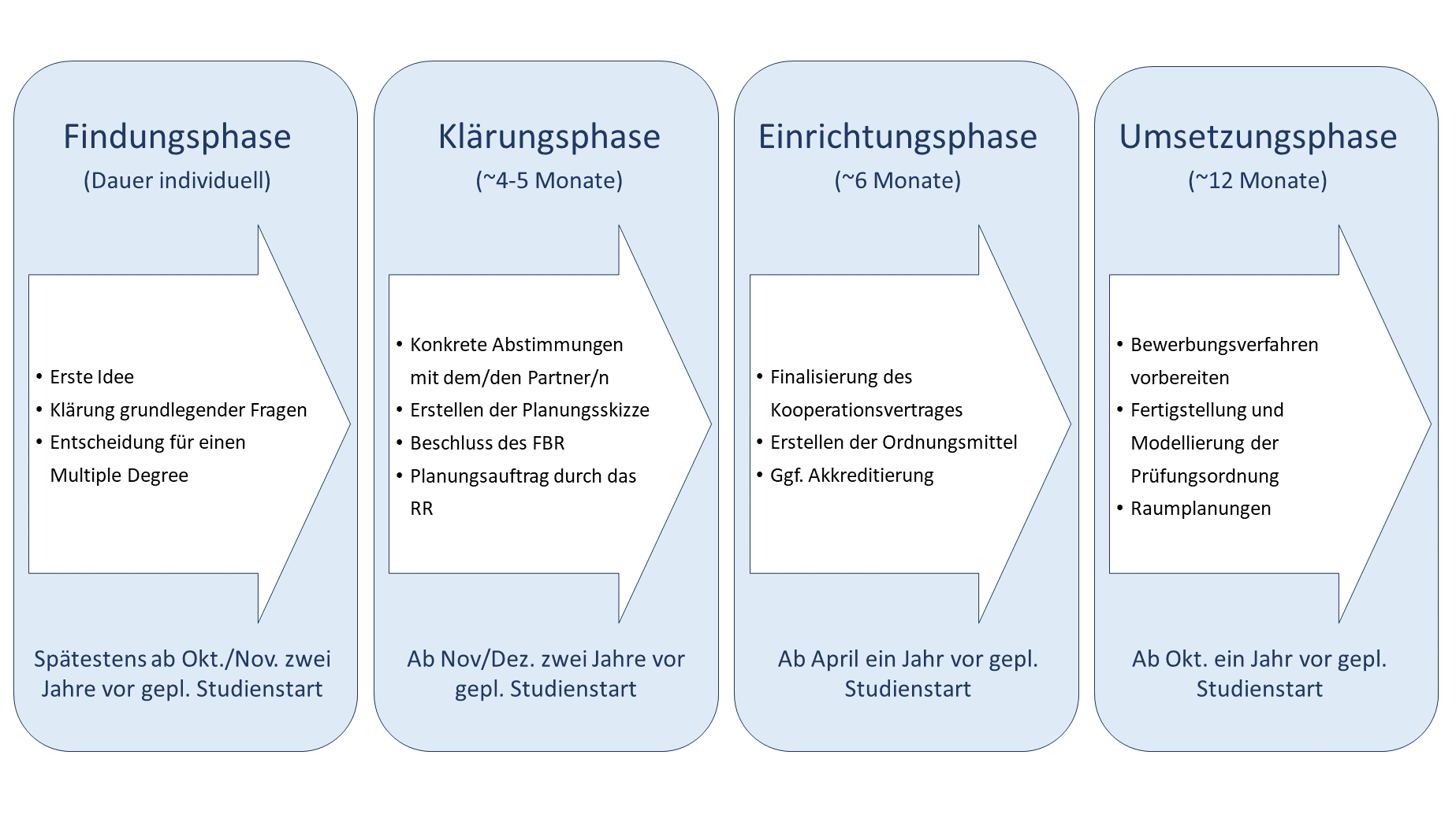 Der Einrichtungsprozess gliedert sich grob in vier Phasen. Insgesamt werden von der ersten, zwischen den Kooperationspartnern kommunizierten Überlegung, bis zum Studienstart i. d. R.. mindestens zwei Jahre benötigt. Bei Programmen mit sehr frühen Bewerbungsfristen sollte ggf. mehr Zeit eingeplant werden, ebenso bei Joint Degrees (Programmen mit einem gemeinsamen Abschluss und Zeugnis), bei denen zeitintensive Abstimmungen mit dem/den Partner/n und i.d.R.. eine Akkreditierung erfolgen. Um die inhaltlichen und technischen Anforderungen für das Bewerbungsverfahren und die Studiengangswerbung rechtzeitig umsetzen zu können, muss die eigentliche Planung etwa ein Jahr vor Studienstart abgeschlossen sein.