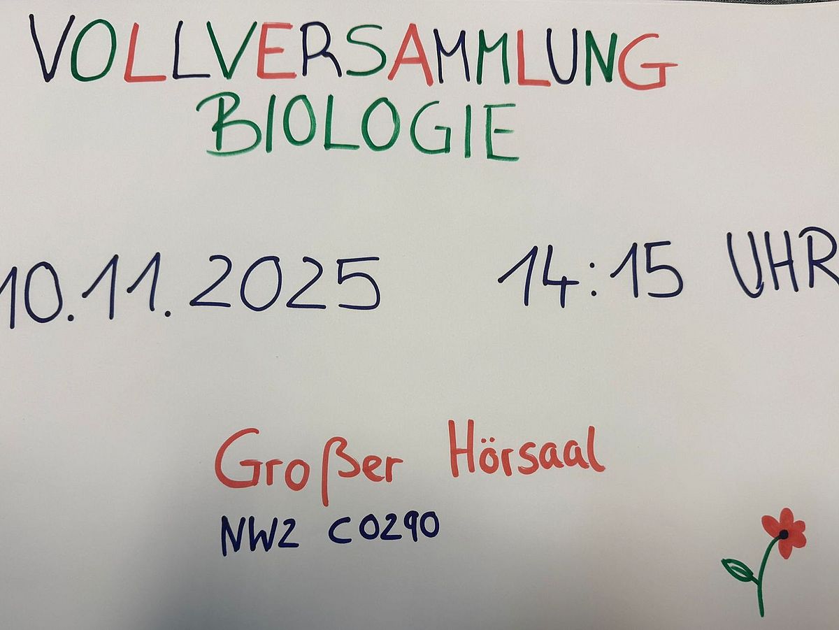 Liebe Studierende, am Montag (10.11.2025) ist es wieder soweit, die alljährliche Vollversammlung der Biologie Studierenden steht an. Um 14:15Uhr im großen Hörsaal (NW2 C0290).