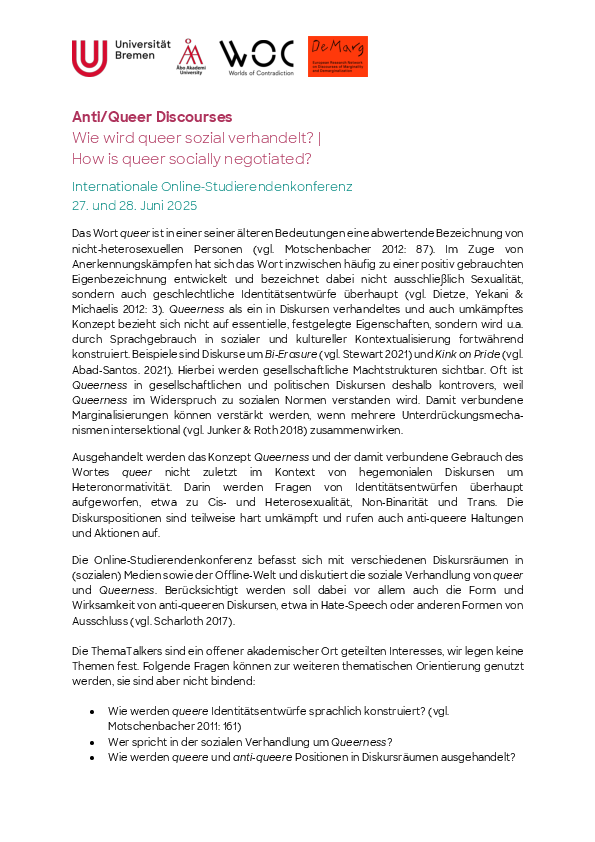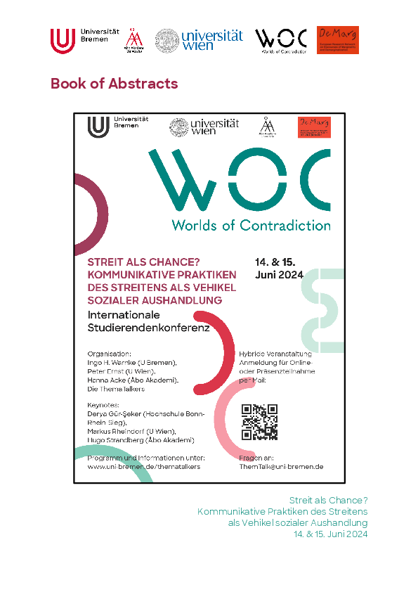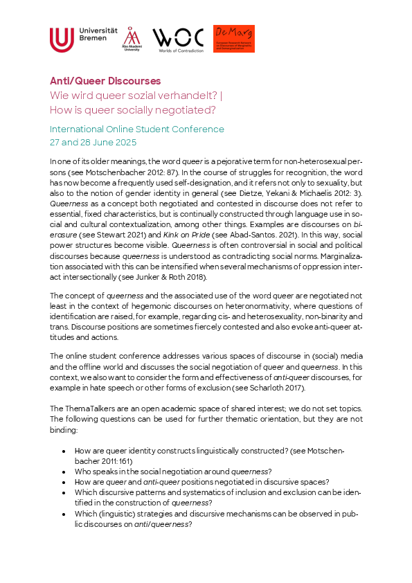 Bei den ThemaTalkers handelt es sich um ein niedrigschwellig organisiertes, wissenschaftliches Kollektiv aus Dozierenden und Studierenden der U Bremen, U Wien und Åbo Akademi. Die diesjährige Konferenz findet in Kooperation mit WOC und DeMarg statt.