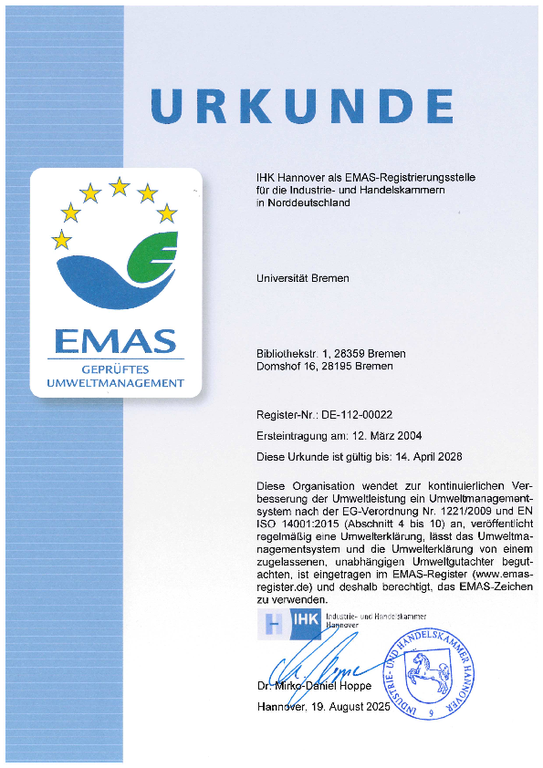 (Eco-ManagementAudit Scheme), dass die gesetzlichen Anforderungen weit übertrifft. Jetzt wurde das Zertifikat bereits zum 22. Mal erteilt. Ein eindrucksvoller Beleg für die hervorragende Arbeit des Umweltmanagements an der Universität Bremen.