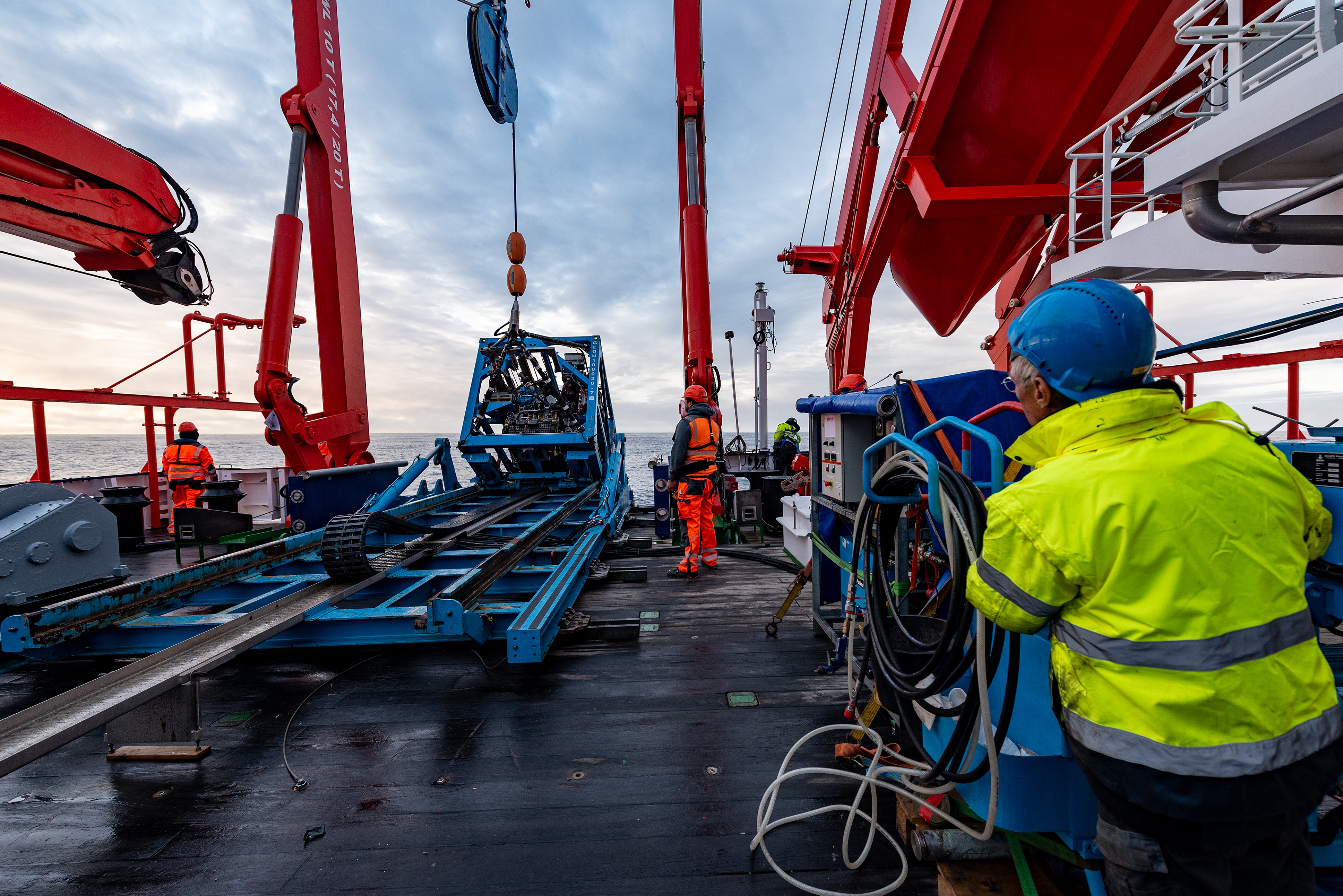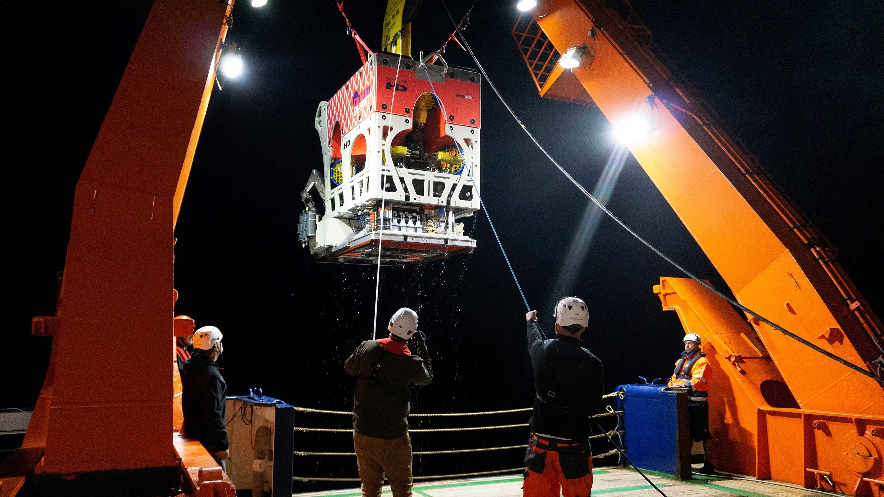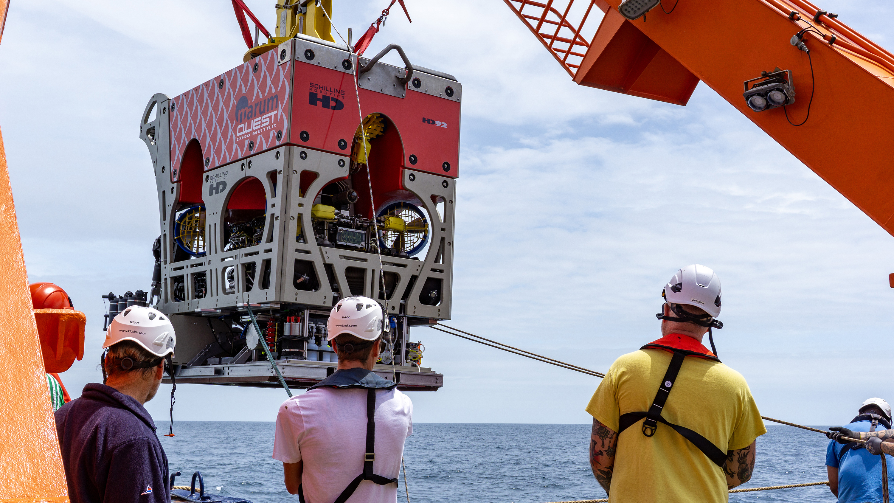 © MARUM − Zentrum für Marine Umweltwissenschaften, Universität Bremen / M. SchröderDer Tauchroboter MARUM-QUEST 5000 wird im Nordatlantik von Bord der METEOR zu Wasser gelassen.