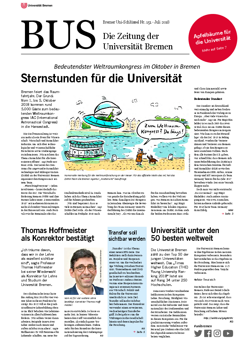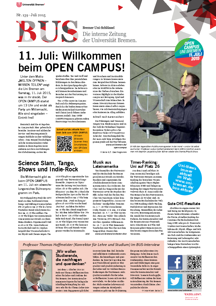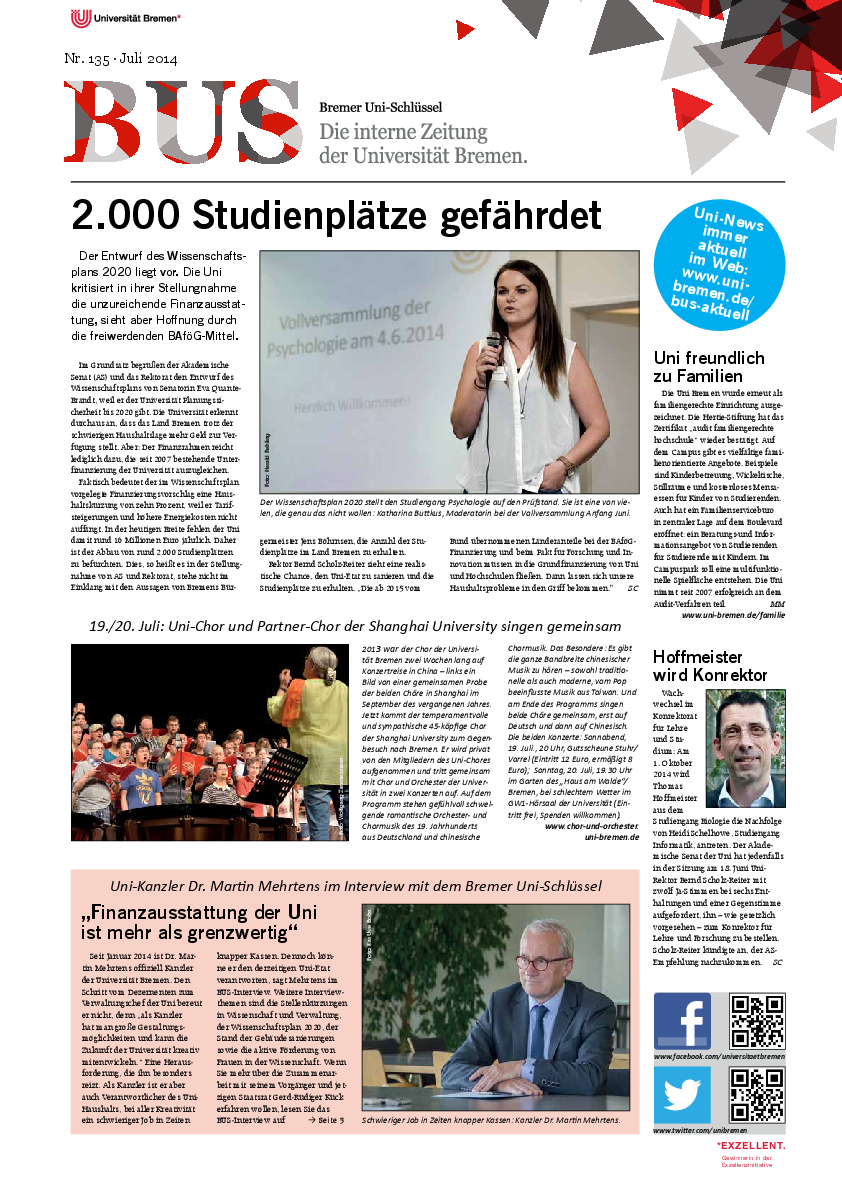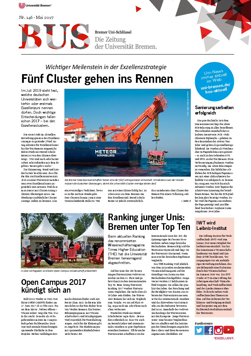 Über den Zeitraum von 30 Jahren war der „Bremer Uni-Schlüssel“ (BUS) die Zeitung der Universität Bremen. Bis 2019 informierte der BUS Studierende und Uni-Angestellte über das Leben und die Aktivitäten auf dem Campus. Dazu zählten zum Beispiel Artikel über Entwicklungen in den Fachbereichen, aus dem Uni-Leben, über Neu- und Umbauten, Schwerpunkte aus Forschung und Lehre sowie Personalien. Der BUS erschien viermal im Jahr. Für die Universität war der BUS ein Forum zum Informationsaustausch und zur Förderung von Diskussionsprozessen. Mit der letzten Ausgabe Nr. 152 vom November 2018 wurde die Zeitung BUS eingestellt.