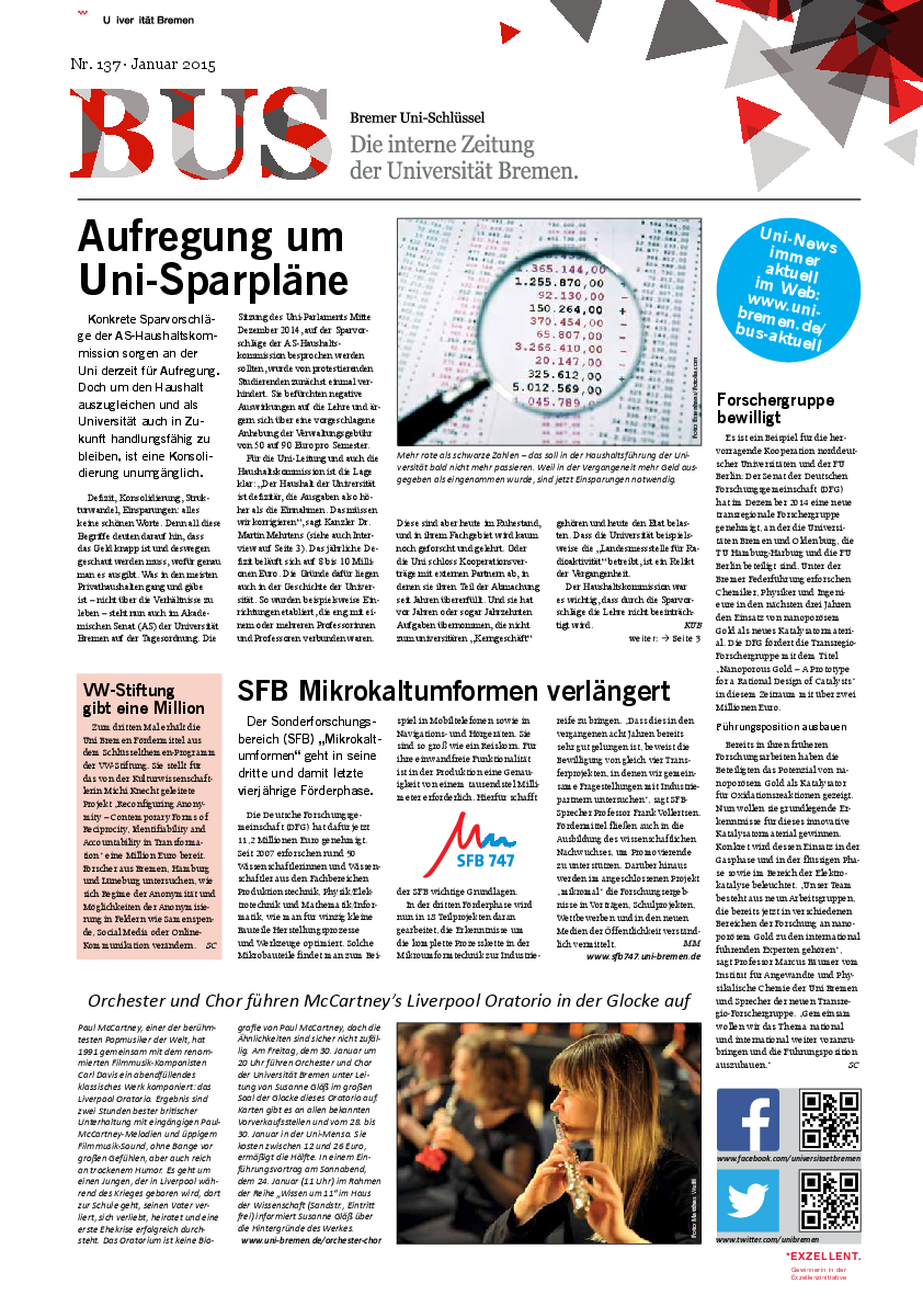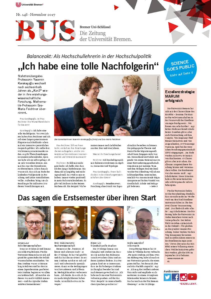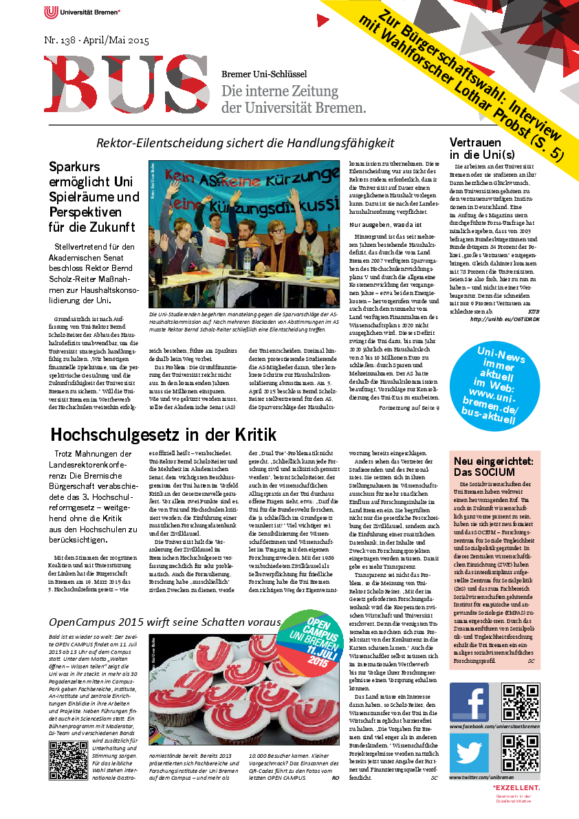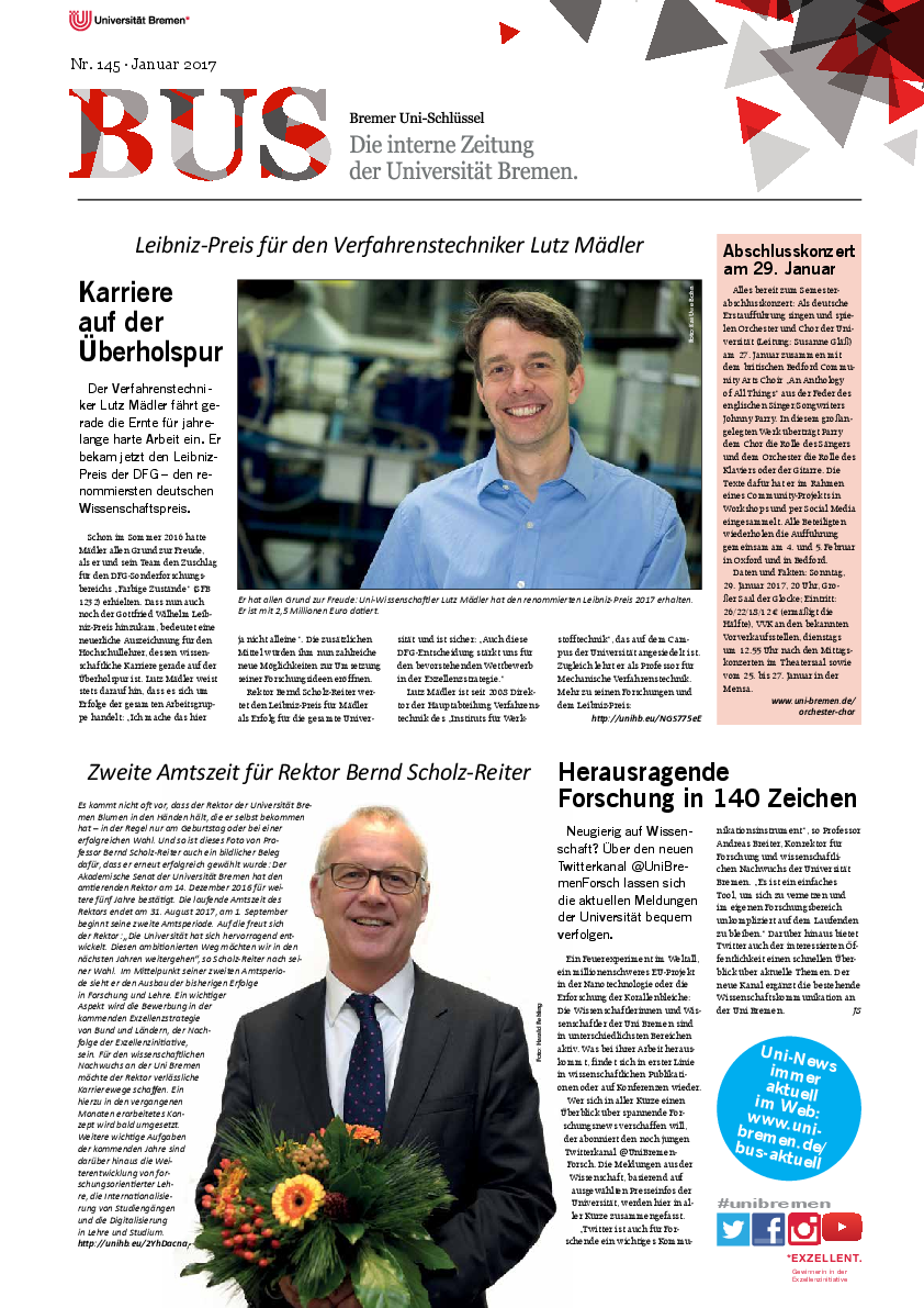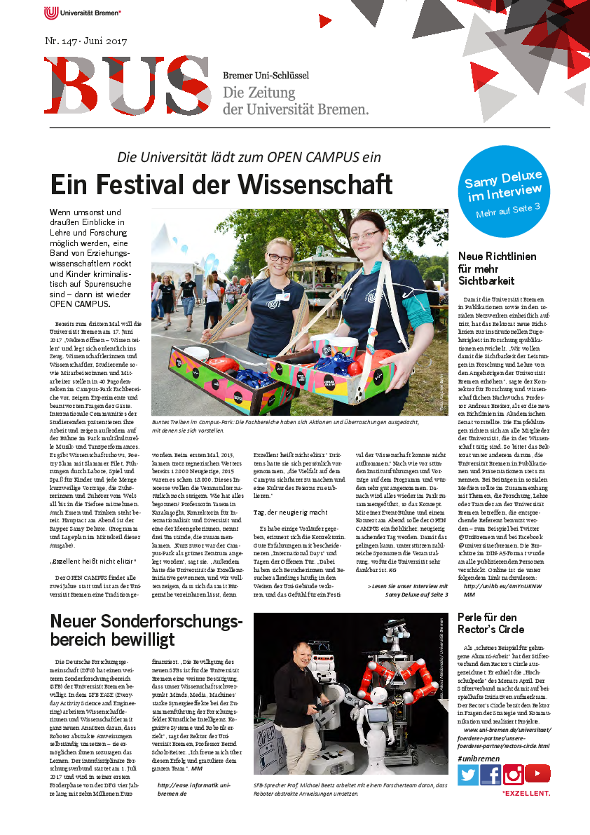 Über den Zeitraum von 30 Jahren war der „Bremer Uni-Schlüssel“ (BUS) die Zeitung der Universität Bremen. Bis 2019 informierte der BUS Studierende und Uni-Angestellte über das Leben und die Aktivitäten auf dem Campus. Dazu zählten zum Beispiel Artikel über Entwicklungen in den Fachbereichen, aus dem Uni-Leben, über Neu- und Umbauten, Schwerpunkte aus Forschung und Lehre sowie Personalien. Der BUS erschien viermal im Jahr. Für die Universität war der BUS ein Forum zum Informationsaustausch und zur Förderung von Diskussionsprozessen. Mit der letzten Ausgabe Nr. 152 vom November 2018 wurde die Zeitung BUS eingestellt.