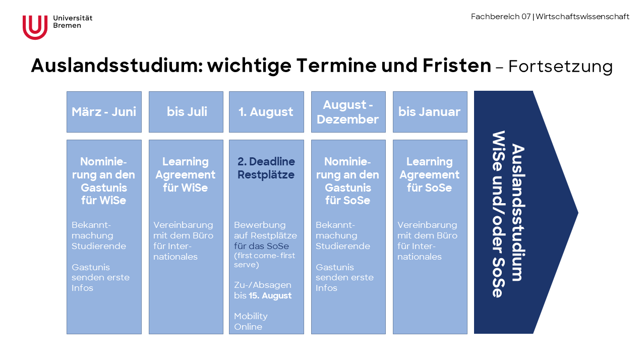 Das Bewerbungsverfahren am Fachbereich Wirtschaftswissenschaft weicht von dem Bewerbungsverfahren an anderen Fachbereichen ab. Für eine Bewerbung an einer Partnerhochschule des Fachbereich 7 ist es notwendig sich an unsere Fristen und Prozesse zu halten, um in der Auswahl berücksichtigt zu werden. Der reguläre Bewerbungsschluss für ein Auslandssemester im darauffolgenden akademischen Jahr (beginnend mit dem Wintersemester) ist am 15. Januar. Die Bewerbung erfolgt über das Online-Bewerbungsportal des Fachbereichs.