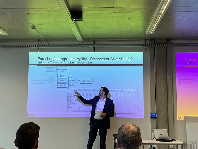 In einem Deep Dive in das Forschungsprogramm „Agility – Ricochet or Silver Bullet?“ führte die Antrittsvorlesung in fortgeschrittene Forschungsprojekte ein und bot einen Ausblick auf kommende Forschungsaktivitäten. Neben laufenden Dissertationen beleuchtete Prof. Röth interdisziplinäre Forschungsinitiativen mit dem Fachbereich 4 (Produktionstechnik – Maschinenbau und Verfahrenstechnik) sowie dem Fachbereich 1 (Physik / Elektrotechnik) der Universität Bremen. Abgeschlossen wurde der Ausblick auf Drittmittelprojekte mit dem Bremer Mittelstand rund um das Thema „Unternehmensnachfolge durch Geschäftsmodellinnovationen“.