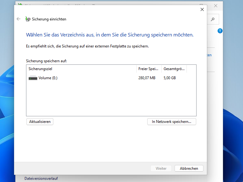 Nach einem kurzen Moment öffnet sich ein neues Fenster. Hier soll das Sicherungsziel ausgewählt werden.