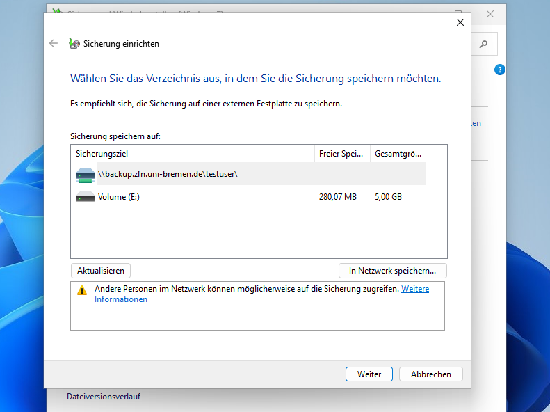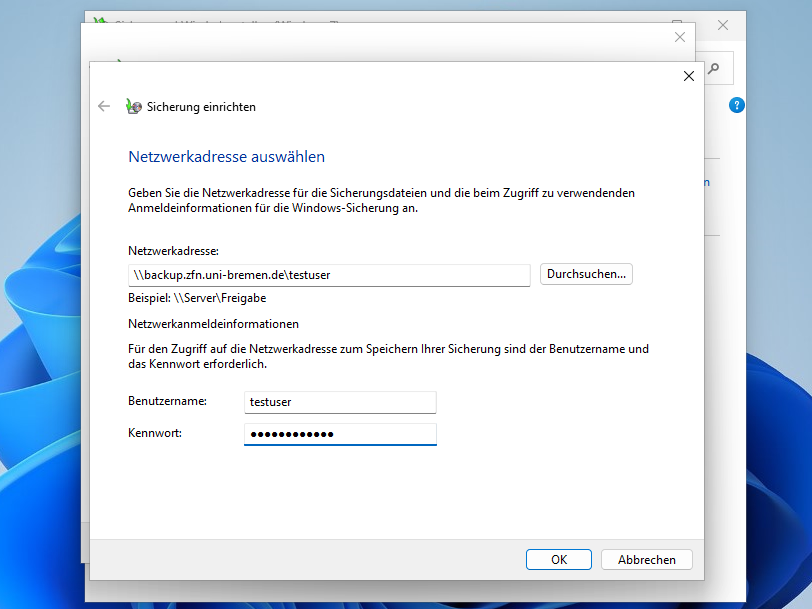 Geben Sie nun als Netzwerkadresse folgendes ein: \\backup.zfn.uni-bremen.de\testuser