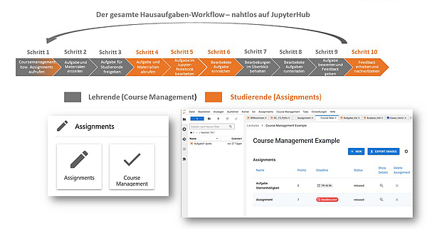 - Erstellen, verteilen, verwalten und einsammeln von Hausaufgaben und Übungen, ohne die Jupyter-Umgebung verlassen zu müssen
