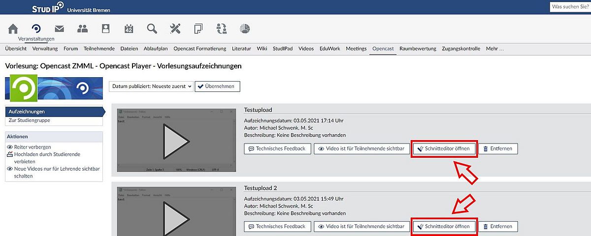 Der Opencast Schnitteditor ist über das Opencast Stud.IP Plugin erreichbar. Der Schnitteditor bietet Ihnen die Möglichkeit, Ihre Videos einfach und schnell zu bearbeiten. Die Ihnen zur Verfügung stehenden Funktionalitäten werden im folgenden aufgezeigt: