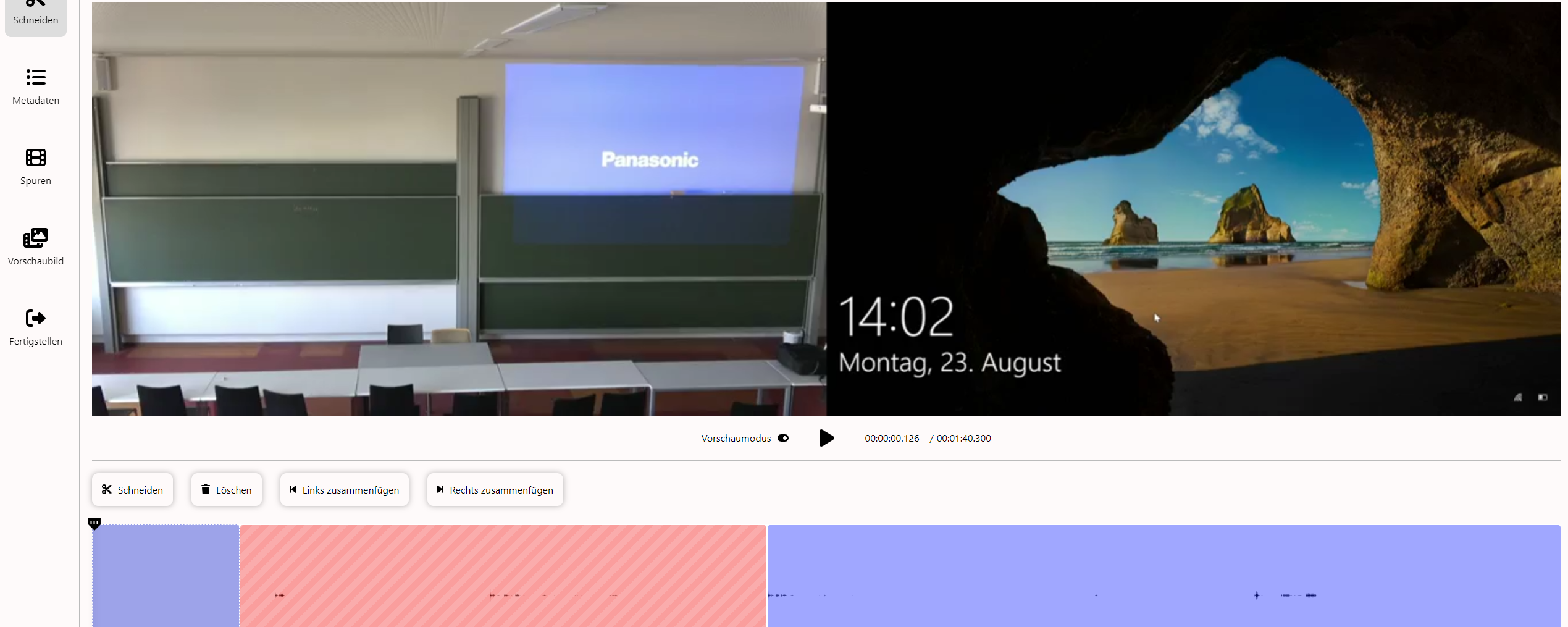 Mit dem "Publish with subtitles and translate" Workflow werden die Änderungen vom Schneiden auf das Video umgesetzt, sodass das geschnittene Video anschließend auf Stud.IP zu sehen ist. Dies kann mehrere Stunden dauern, da Opencast das Video neu verarbeitet. Außerdem werden die Untertitel inklusive der Übersetzung auf das nun geschnittene Video neu erstellt.